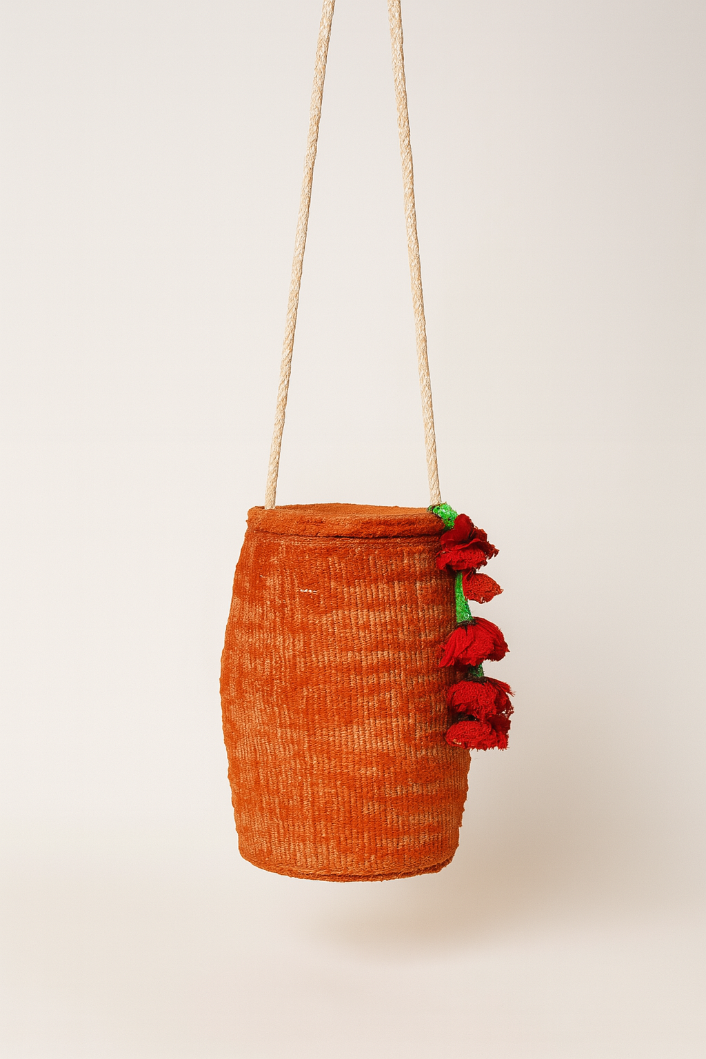 Bold, Playful, and artisanal.This handwoven bucket bag is a statement piece in fiery red, adorned with crochet watermelons for a lively twist. Crafted with care, its structured silhouette and macrame handle make it both functional and eye-catching. Perfect for adding a pop of color to your summer looks.